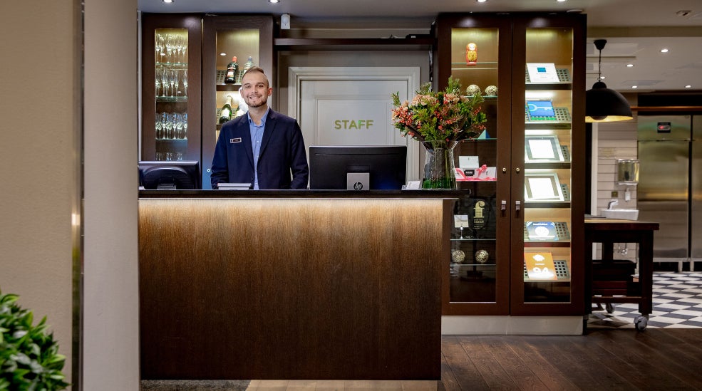 En smilende resepsjonist står ved en trepult, dekorert med blomster, i en hotellobby. Bak er en utstillingshylle med glass og priser. En dør merket "STAFF" er synlig.