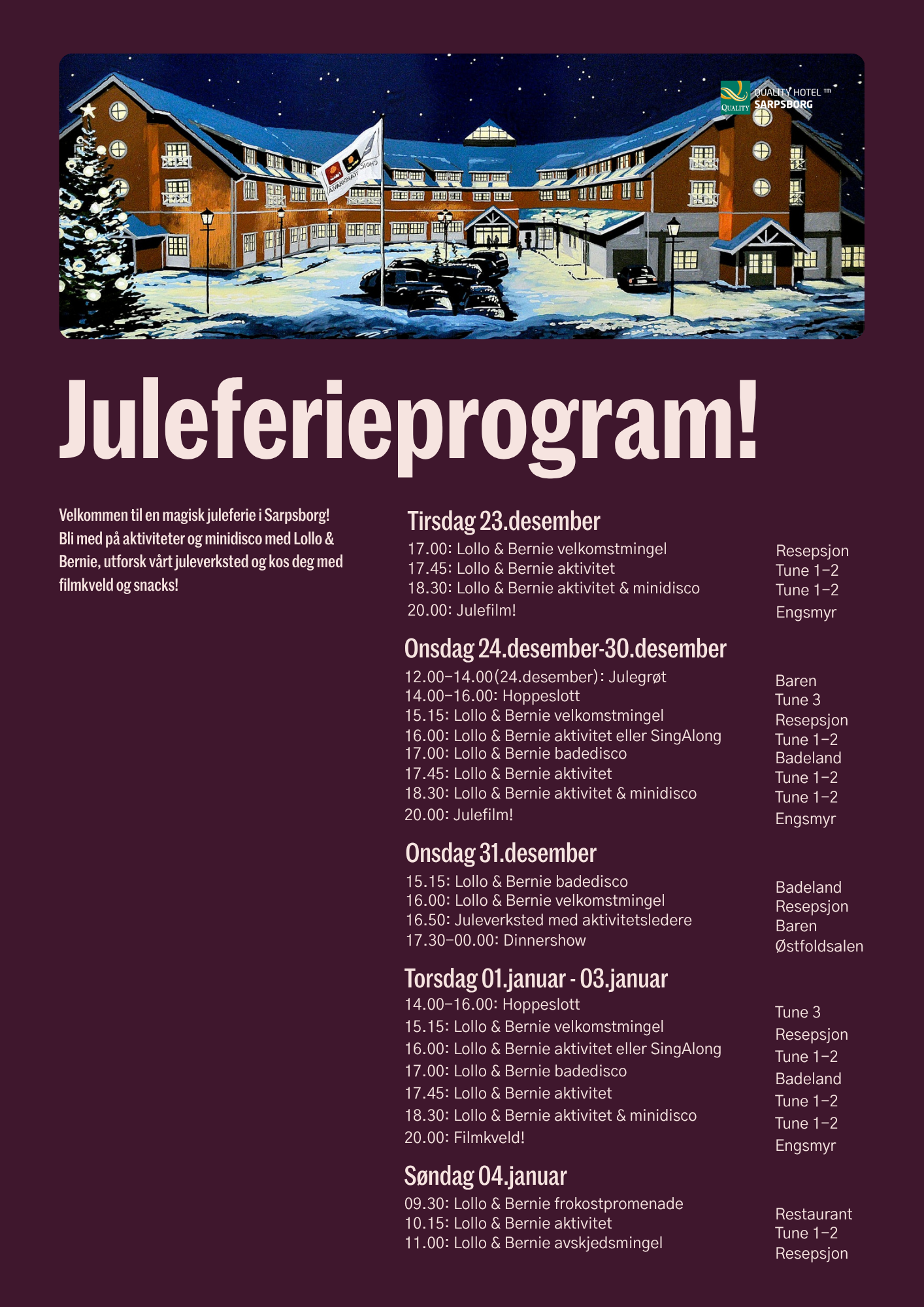 Velkommen til en magisk romjul på Quality Hotel™ Sarpsborg! Gjør deg klar for en magisk romjulstid med familien på Quality Hotel™ Sarpsborg fra 23.-30.desember! Vi har satt sammen et flott pakketilbud som gjelder én natt og inkluderer: 🧡 Aktiviteter med Lollo & Bernie 👙 Inngang til badeland ⛳️ Inngang til superland 🤤 Smakfull middag 🍽️ Herlig hotellfrokost Se fullt aktivitetsprogram for julen her! Priser: Enkeltrom: 1596 NOK pr. døgn for én person Dobbeltrom: 2296 NOK pr. døgn for to personer Tresengsrom: 2996 NOK pr. døgn for tre personer Firesengsrom: 3696 NOK pr. døgn for fire personer Femsengsrom: 4396 NOK pr. døgn for fire personer For booking av connecting rom eller to rom ved siden av hverandre -> kontakt resepsjonen på 📞+47 69 10 15 00 eller 📧 q.sarpsborg@strawberry.no Connecting rom: 3196 NOK pr. døgn for tre personer Connecting rom: 3896 NOK pr. døgn for fire personer To rom ved siden av hverandre: 3296 NOK pr. døgn for fire personer Skap en uforglemmelig romjulstid med familien hos oss på Quality Hotel™ Sarpsborg!🎄❤️ Inkludert i pakken: Aktiviteter med Lollo & Bernie Superland Badeland Smakfull middag Frokost