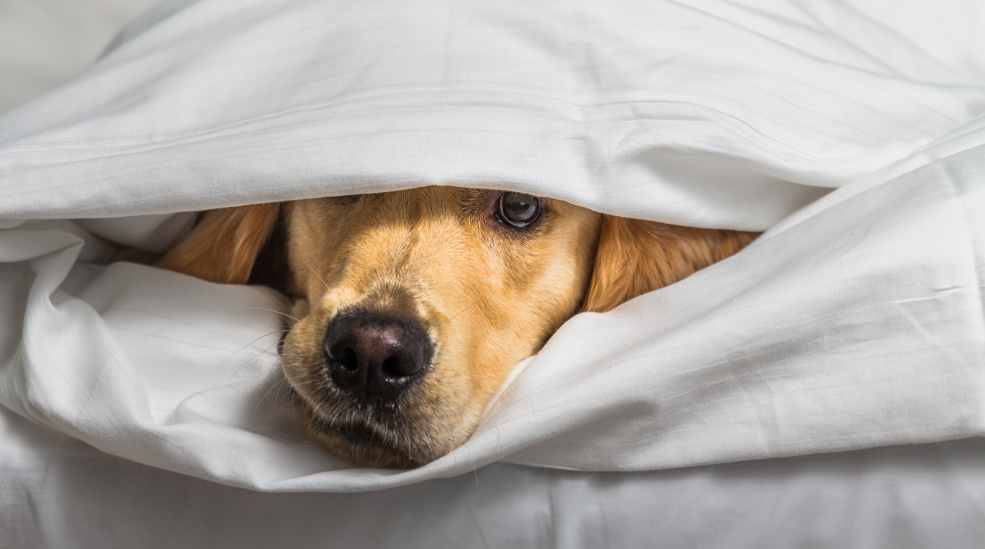 En golden retriever hviler hodet på en seng, ser avslappet ut. En varm lampe skaper en koselig stemning i det svakt opplyste rommet.