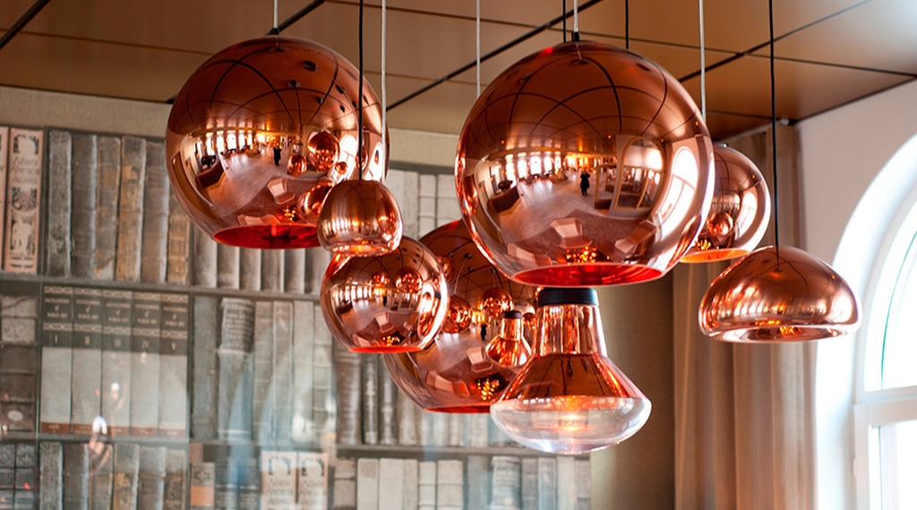 Fire moderne stoler omgir et lite bord under kobberlamper i et rom med en vegg designet som bokhyller. Store vinduer og planter skaper en innbydende atmosfære.